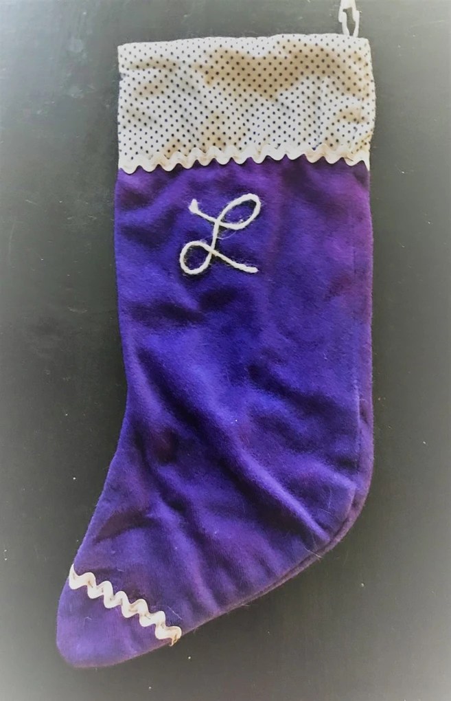 I would like to say that I started praying for a miracle but I didn’t. I fretted and worried instead. I did finally share my dilemma with my mom. She immediately went into her fabric stashes and craft supplies. We sat around her dining room table as she orchestrated the design of poinsettias out of felt and pipe cleaners and glitter as a finishing touch, of course. Later that week she surprised us with Christmas stockings she made … blue velvet and dotted Swiss material at the top, trimmed in white rick rack and with our own individual initial glued on in yarn on each of them. Only one problem now; no tree.