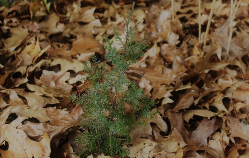 Unfortunately, I didn’t save a picture of that much crooked, short, fat tree, but here’s one of a baby spruce I will share with you that sprung up in my yard and a few feet from that a holly bush which also began growing, without me planting either one.